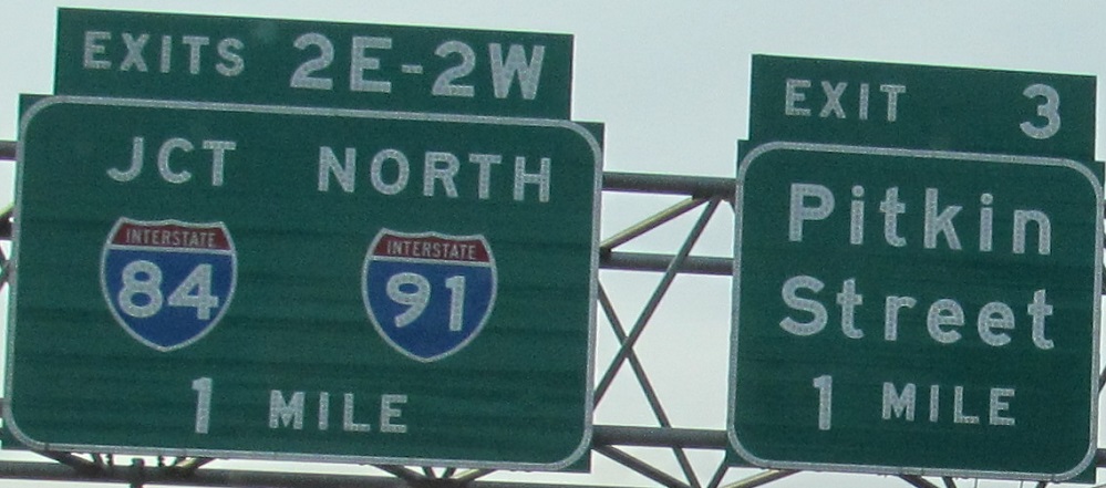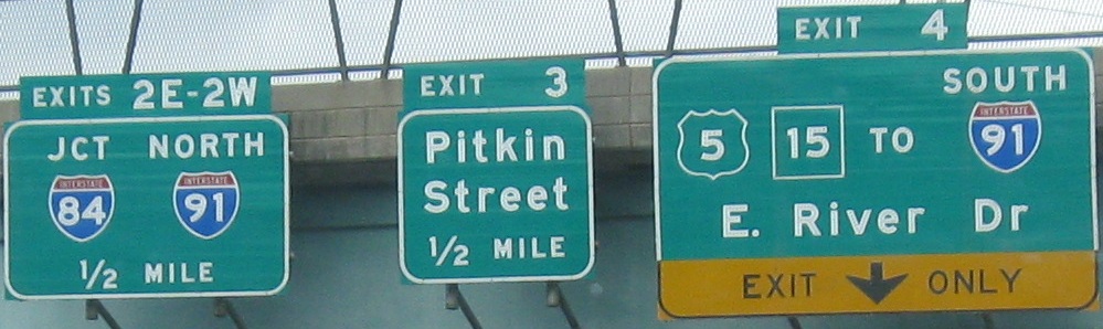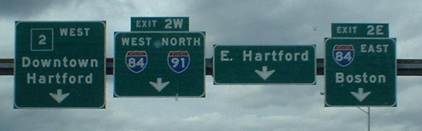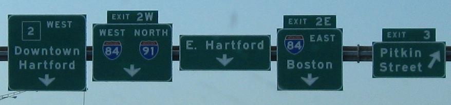 The first two photos are left and right sides of the same gantry. The CT 2/I-84/US 6/US 44 interchange is one of the only natural five-ways I know of - you can get from anywhere to anywhere if you know what you're doing. The five "prongs" are CT 2 to the west, CT 2 to the southeast, I-84/US 6/US 44 to the west, I-84/US 6 to the east, and a surface connection that handles US 44 traffic not going straight onto the next I-84 exit (53) and following 44 that way. That surface connection is a freeway stub that would have been part of an I-284 up the east side of the Connecticut River; follow the link at the bottom of the page for photos from it. The East Hartford exit should be numbered, say Exit 2A, and should include a US 44 EB shield. But, as you can see, both US 44 and US 6 lack any signage whatsoever.