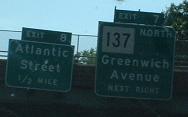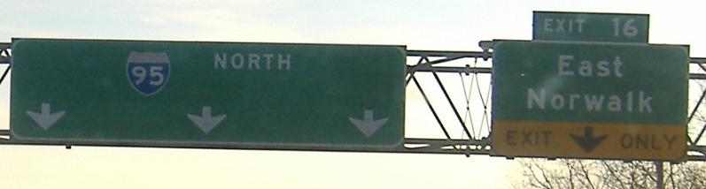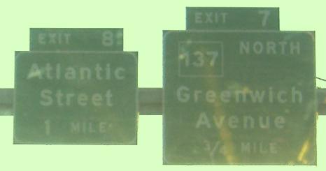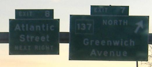 The last one, with an oversize I-95 shield (given sign size) is on the EB (aka NB) frontage road in Stamford, S. State Street at Elm St. Note the different CT 137 shields; button-copy CT signage mixes its unique brand of outline shields with standard squares fairly randomly.