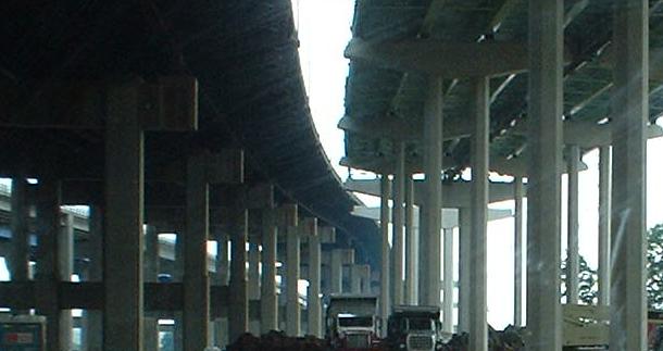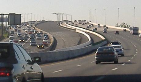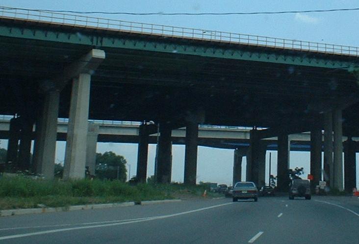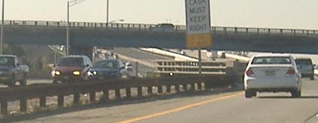 In summer of 2004, expansion of the Alfred Driscoll (I think his middle initial is P.) Bridge was in progress from the north shore of the Raritan River. The current bridge is 12 lanes, 6 each direction, but 10' wide and with negligible shoulders. If you do the math, 12 10' lanes is 10 12' lanes. Add shoulders, and you end up with the number 8. Once the new span is complete and the old one touched up, the old one will carry 8 northbound lanes, possibly in a configuration that separates Exit 127 and/or 129 traffic from the mainline. The new span is only equipped for seven lanes, curiously, especially curious given that the Raritan tollbooth is now southbound-only; as part of Express E-ZPass installation at more mainline Parkway tollbooths, they are being alternately demolished NB and SB, and tolls doubled to 70 cents. Why not 75 cents?