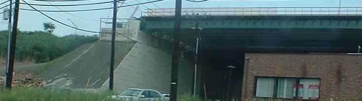 All of these photographs were taken from Smith Street, which runs right along the river, by the construction entrance, and to a bunch of cool signage at either end. The first photo shows the limit of the bridge work, with the tie-in to the main roadway to be performed later. The second photo shows the little bit of multilane-age that Smith Street gets to enjoy, as a divided highway that's more a set of ramps than a highway. The rest of the photos show the limits of construction as of August 2004, with the new US 9 span to the left of the second-from-last photo.
