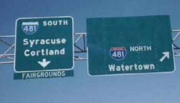 Off Exit 34A, still in Syracuse - I-481 was built after the Thruway, hence the suffixed exit. The second photo is in the same place as the first, but the sign on the right has been replaced and the one on the left is probably next. Hey Mister Contractor, they didn't give you all that space for nothing!