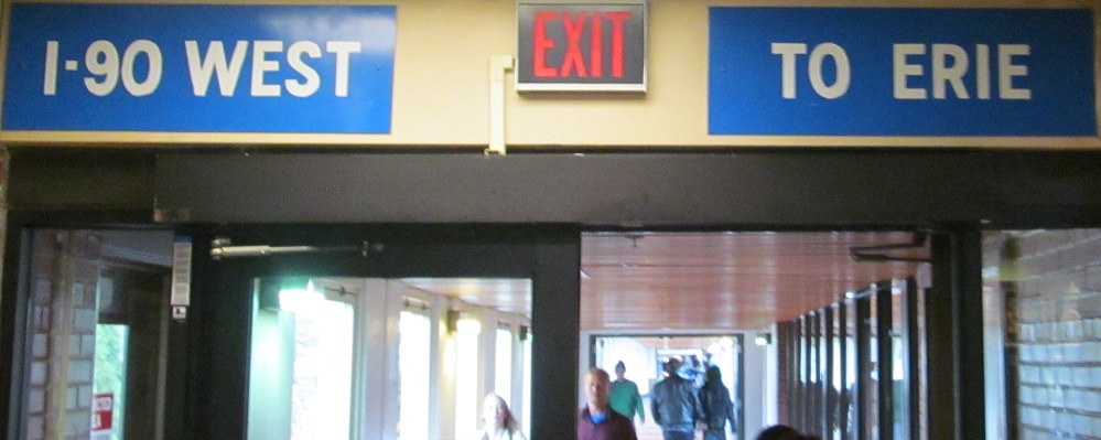 Pedestrian signs inside the Angola Travel Plaza, located in the median of I-90 with separate parking lots on each side, and notable for being able to walk over the roadways and look down at traffic. But about that font.