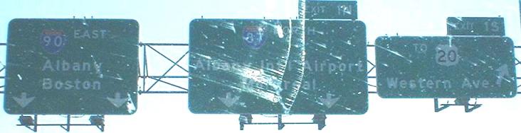 I-90 approaching the end of its run on the Thruway. Exit 24 is the southernmost mention of Montréal in the US as far as I know; I-89 and US 7 in VT don't have such a mention until much farther north. Note the perfect Mass Pike shield, which may have been commissioned from the Mass. Turnpike Authority (or at least from their spec book). The signs lie to get you to pay more; stay on I-90 and enjoy a cheaper ride.