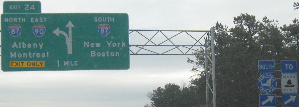 This is I-90 EB and I-87 NB - exit numbers follow I-90 because I-87 was never supposed to come this way, but Exit 1 for one highway is Exit 1 for the other anyway; it's just that I-87 must exit off itself with this numbering scheme. The rest of the Northway is signed to US 20, where it ends for now. Eventually, an E-ZPass only extension might be built to turn I-87 into a continuous freeway. When the New York Thruway was built, I-90 was supposed to follow the Berkshire Extension (off the Mass. Pike) onto the mainline, multiplexing with I-87; I-87 would have left in the vicinity of I-787, paralleled the Thruway for a short distance, and then run onto the Northway. Instead, an eastern bypass of Albany was built to the Berkshire's exit B1, and that became I-90, allowing a brief moment of free passage between two tolled roads (unless you take I-88 to/from I-90, in which case you don't pay NY one cent of toll). The Northway was never completed south of US 20, so I-87 was brought off the Thruway at the same place I-90 comes onto it (Exit 24), which heavily favors I-90 traffic. Because now suddenly a lot of through traffic was using a tight loop, measures were taken to widen the interchange, and a flyover ramp was built at the I-90/I-87 interchange just to the east, but still I-87 traffic is getting the raw end of the deal. The Northway runs smack into US 20 and ends at a traffic light. Both the Thruway and Northway are therefore briefly unsigned reference routes.