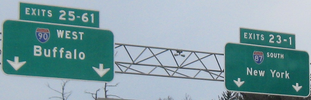 WB at I-190 when it was still a toll road, courtesy Doug Kerr, and then the last exit before I-90 resumes being tolled. Notice that exit numbers increase heading westbound because Exit 1 on the Thruway is at the New York City line.