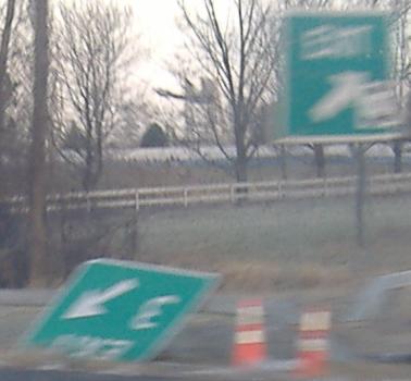 This westbound gore sign fell or was knocked down, but rather than remount it, NYSDOT put up a replacement sign sans exit number, and rather than even remove the old one to a safer place for remounting, it's out there on the shoulder.