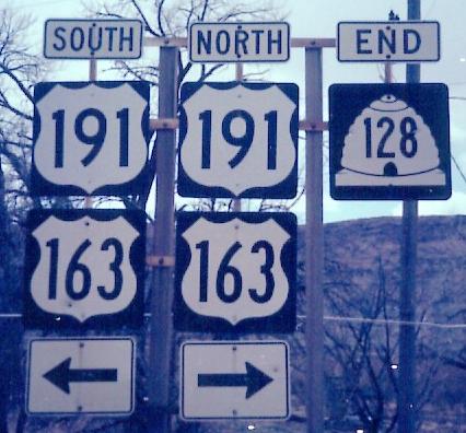 LC- Opposite direction, every sign is wrong but all the scenery is so right. The I-80 comes closest - the arrows should just be one over each lane. The middle sign needs to be wide enough to put its two destinations on two sides so that it doesn't run together as a single, schizophrenic ski area. IF the sign on the right looked anything close to the sign on the left, I could start to accept it.