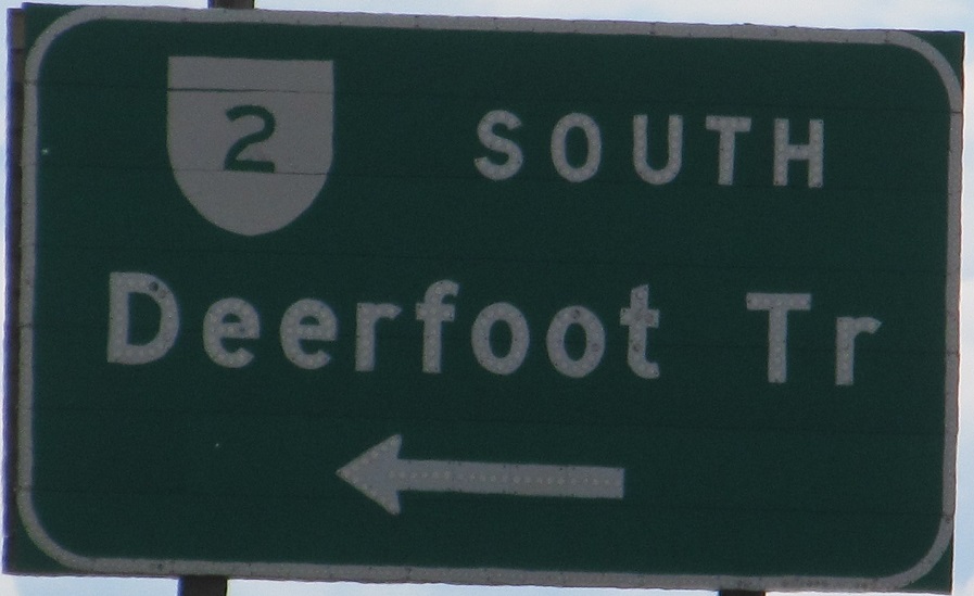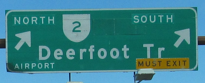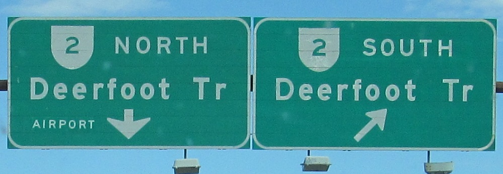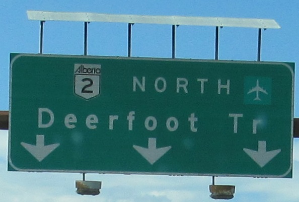 This is a very old shield type that I've only seen in Calgary. It's not really the right shape, and it's printed directly on the sign. The first sign has had a lot of work done. I wouldn't be surprised if it dates to 1980, when the segment of AB 2 (Deerfoot Trail) north of Glenmore Trail opened, and then it was patched over in 1982. (And again with "Airport" at some point.)