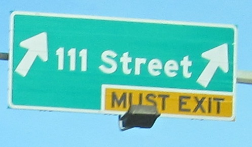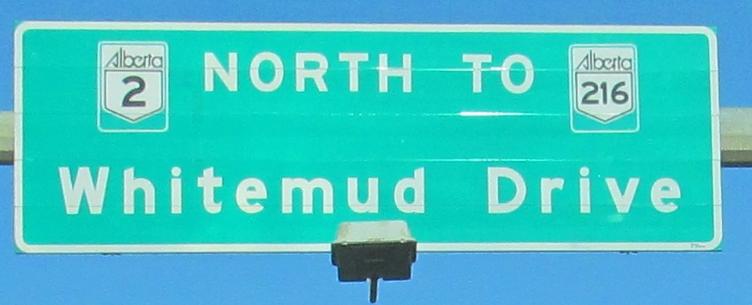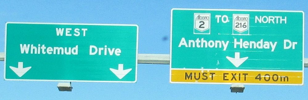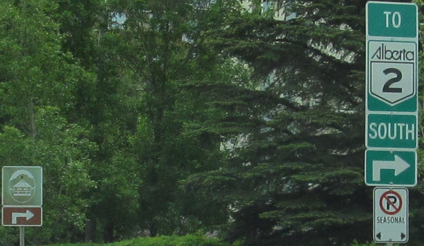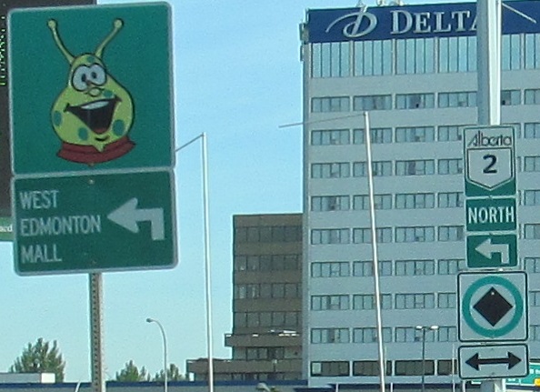 We need to have a talk. This is not an appropriate figure per the Canadian MUTCD or common decency. I recommend sticking the sign and its designer in a large blender. This is where AB 2 turns left onto Whitemud Drive, heading west to AB 216 then randomly beginning again outside downtown instead of taking the intuitive route along its previous alignment.