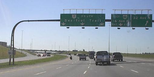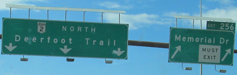 Now heading north on AB 2 itself, where exits are numbered and text is w i d e because that is how Calgary fills space. "Must Exit" should be yellow and the second sign should not be Clearview. But since it is, the text definitely should not be all caps, and the word "TO" should be removed as this exit connects directly. The whole sign is exceedingly overloaded.