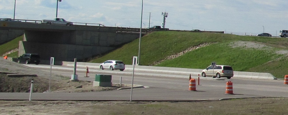 Coming soon? But the road's already here! In 2013, exiting traffic had to head east on Airport Trail, because 96th Ave. NE was not yet finished over the railway to the west. All the traffic you see is going to have to turn left onto AB 2 SB.