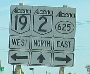 Decent-looking shield assembles on old AB 2 NB through Leduc and Nisku. I won't pretend everything is perfect with shared bolt holes and giant font, but they could have been so much worse. The second one is inaccurate, though; AB 625 continues west until modern AB 2, and ahead should be "TO".