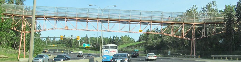 A bunch of "Edmonton special" signs on Whitemud Dr. WB (AB 2 NB), including the reassurance atop this page. There's nothing too wrong with the second one at 122-119 Aves. except for how old the supplemental signs are. And keep the pedestrian bridge.