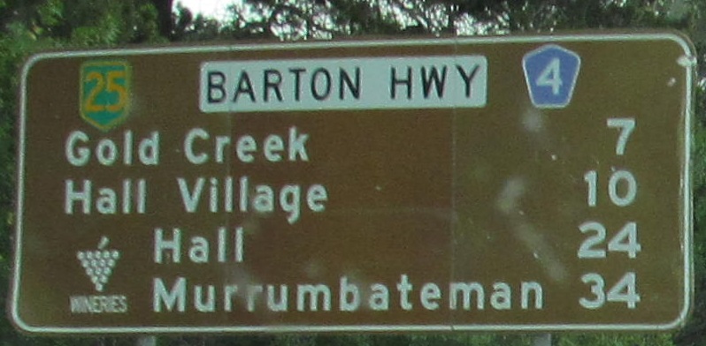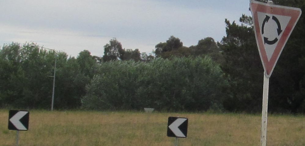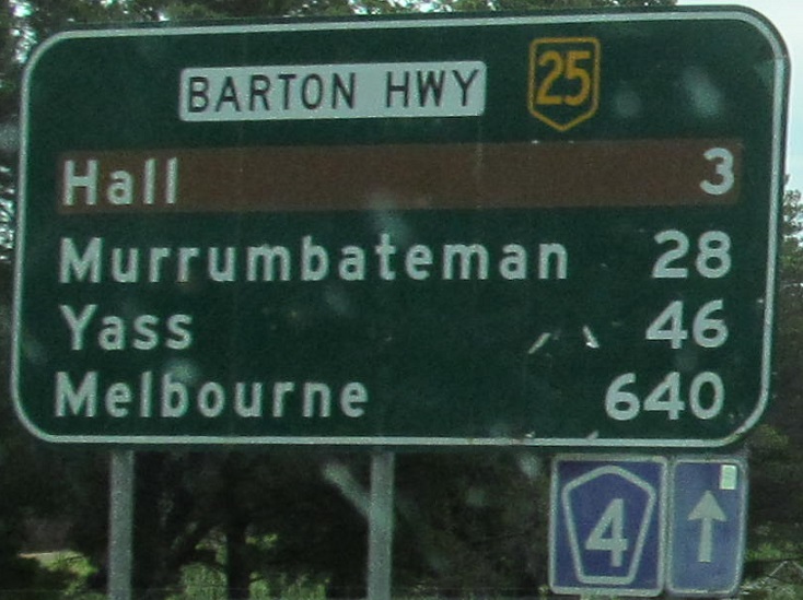A series of WB signs leading out of Canberra. They're all old and therefore the distance signs are now wrong; the NH 25 shield should be covered by an A25 patch. The roundabout at William Slim Dr. and Gundaroo Dr. is now a signalised roundabout-shaped intersection, so you won't see a Give Way sign anymore.