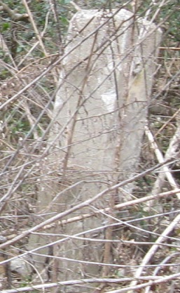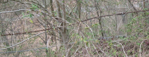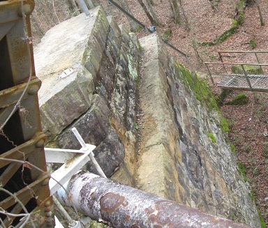 Details on the north side of the bridge, all to the east of the old road: cable guiderail, an old guiderail post, the bridge abutment wingwall.