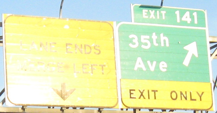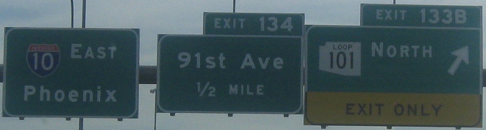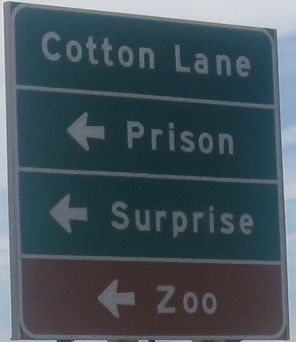 In 2010, I-10 was undergoing serious widening from Loop 303 in toward Loop 101. On the heels of these improvements (as I write this) come a new freeway-grade interchange with Loop 303 that will put those old signs to rest - unless Cotton Lane somehow retains connectivity in the midst of all the work. The sum of the improvements will facilitate further development of the western suburbs from Goodyear toward Surprise!. (I think the town name can only be written with an exclamation point.)