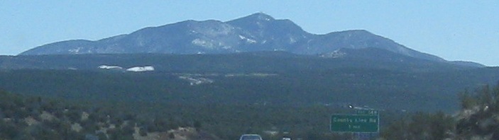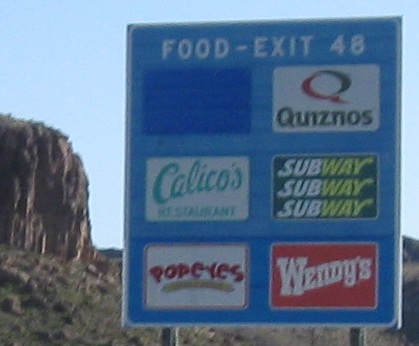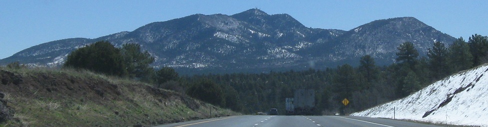 EB from Bill Williams and Bixler Mountains to Bill's namesake town and the Exit 161 ramp (where you see all the right arrows). This is up high enough to have snow in mid-April in the hottest part of the country. Grand Canyon should be signed at Exit 165, not here, because that's where AZ 64 begins and heads north to Grand Canyon Village. (However, Williams does have the beginning of the scenic railroad that also goes there.) I'm sure Williams doesn't mind the extra tourist traffic.