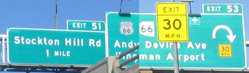 WB button copy cobbled together from ground shots on either side of the underpass. There's quite a lot going on on the Exit 53 sign - it couldn't hurt to bring the airplane symbol down where people might actually notice it, or to leave the 30 MPH signage at ground level where there's clearly already some of it. This is also an unusual instance where Historic US 66 is instead signed Historic Loop 66. It does form a loop through Kingman, but it's almost signed like a business route for the former highway.