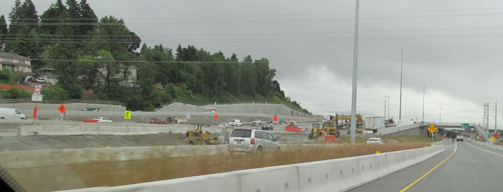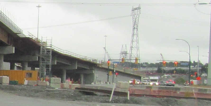 EB in 2013 through reconstruction of the TCH 1/BC 7 interchange in southern Coquitlam. This is being transformed from a toll road-style interchange (trumpet on TCH 1, half-cloverleaf on BC 7) to a free-flowing interchange with multiple C/D roads and slip ramps as the Port Mann Bridge is replaced. The result is that BC 7 EB was relocated from alongside BC 7 WB to the south side of TCH 1. The 3rd construction photo shows the future combined ramp from TCH 1 and BC 7 EB to United Ave. and BC 7B. The last photo is the future TCH 1 WB-BC 7 WB ramp. The new Port Mann Bridge, doubling the old capacity from 5 lanes total to 5 in each direction, opened in 2012, and this construction finished in 2015.