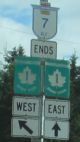 After all that time, BC 7 comes back to TCH 1 yet again. BC 7 was never TCH 1; 1 serves the south side of the Fraser River while 7 serves the north side. Counterintuitively, the best way to head east from here is to go west on TCH 1. It's actually slightly eastward as TCH 1 crosses the Fraser River, and then BC 3 goes east toward Alberta while BC 5 is the fastest route to Kamloops (as opposed to TCH 1). Despite that, due to the railway paralleling BC 7, the desirable EB movement requires a left turn to head "west."