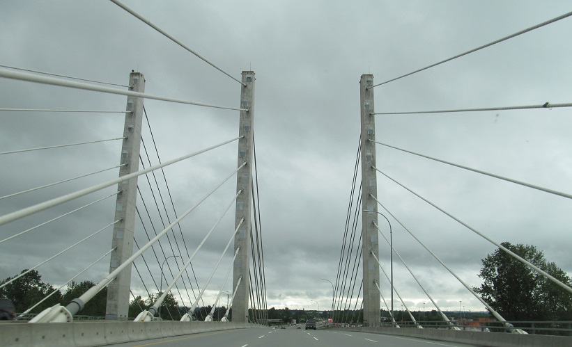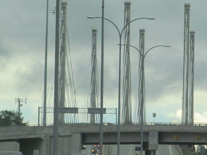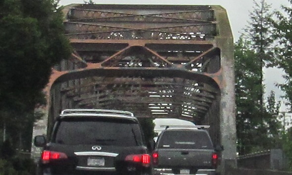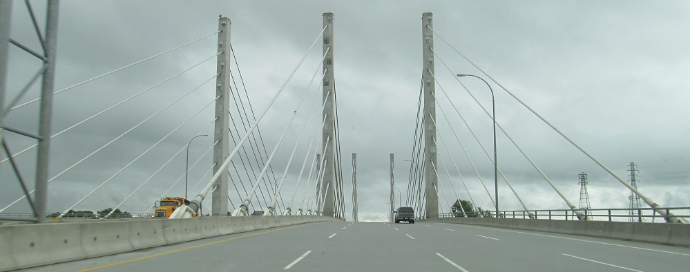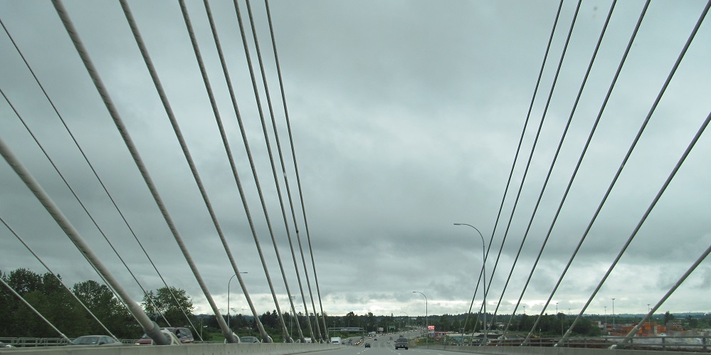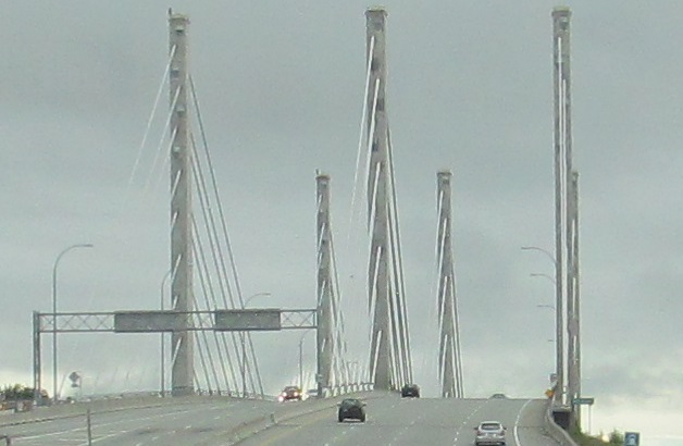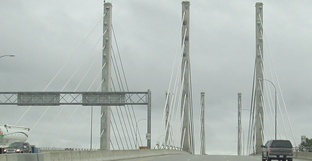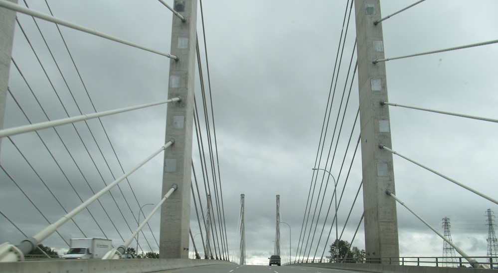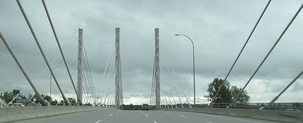 EB across the 2009 Pitt River Bridge. Similar to Coquitlam River, Pitt River was crossed by a 2 lane bridge that was then twinned. Due to rush hour traffic flows, there was a contraflow lane to enable 3 lanes in a single direction. Also, the older EB side was a swing span, so marine traffic became an issue. Now, with double the capacity and a taller fixed span, there should be no traffic issues within the lifespan of this bridge.