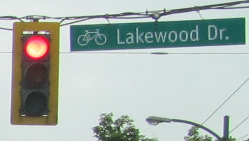 There is no traffic signal at Lakewood Dr. What you see is a lie. Actually, it's a pedestrian signal that's normally flashing green, which is probably why there's a bicycle symbol on it. (A pedestrian symbol may have made more sense, or both.) Lakewood Dr. just has a stop sign and they can go while Broadway is stopped. Since I caught the rare pedestrian crossing here, that gave me a chance to spot this very Canadian bus. It hasn't done anything wrong, but it still must apologize.