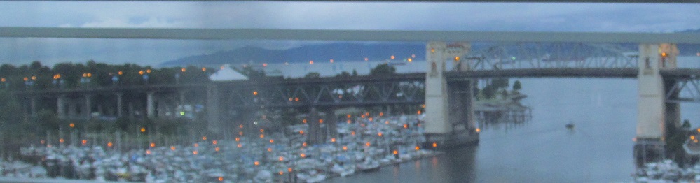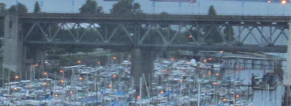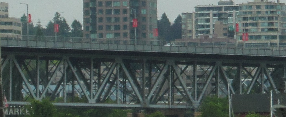 The Granville Bridge is mostly nondescript from above. The first photo is the north portal to the bridge and the second photo looks east from Sunset Beach Park. I tried to get a photo of the old 27 tonne weight limit sign, but that's what 5:30 AM ambient light will do. I did a little better photographing the Burrard St. Bridge to the west.