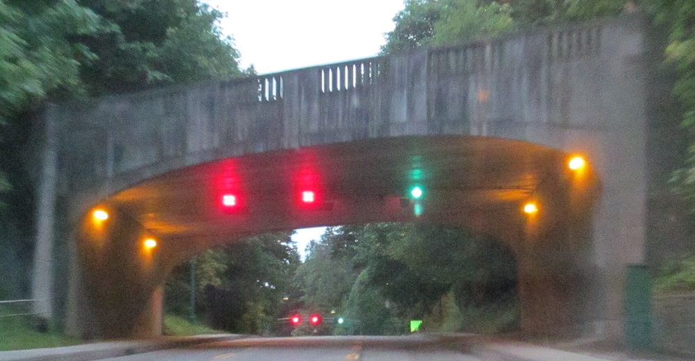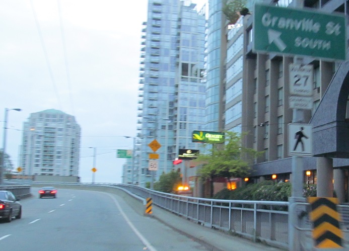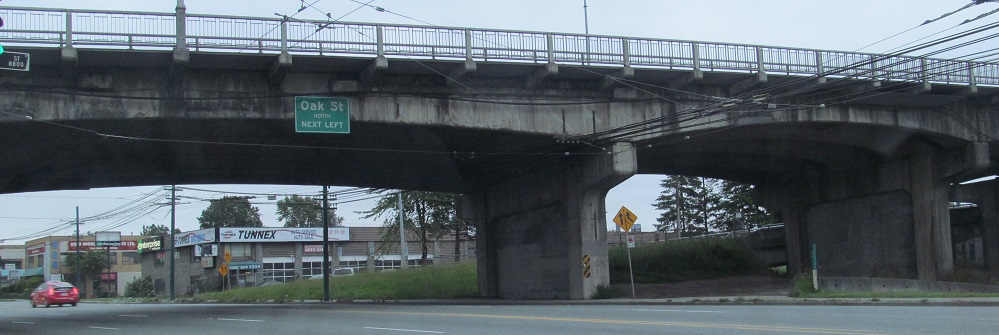 Looking east along SW Marine Dr. in South Vancouver at the northernmost overpass on the BC 99 freeway. After this, BC 99 dumps onto surface streets. It's pretty much all tourist traffic from Seattle and Bellingham, WA, but there are plenty of commuters who need to head north into the city. Since there's no freeway serving downtown, the main north-south streets are all overcrowded.