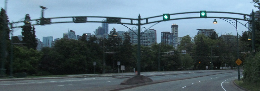 Continuing south through Stanley Park, there are a lot of sparkly lights to distract tired drivers at dawn. It's nice to provide lane use arrows where there are 5 lanes, but that is meaningless when the bridge only has 3.