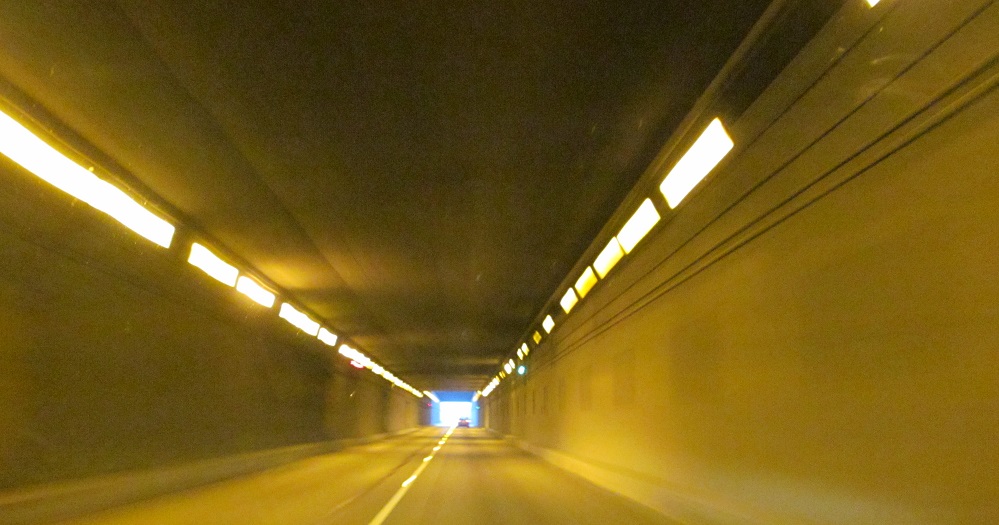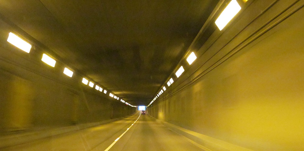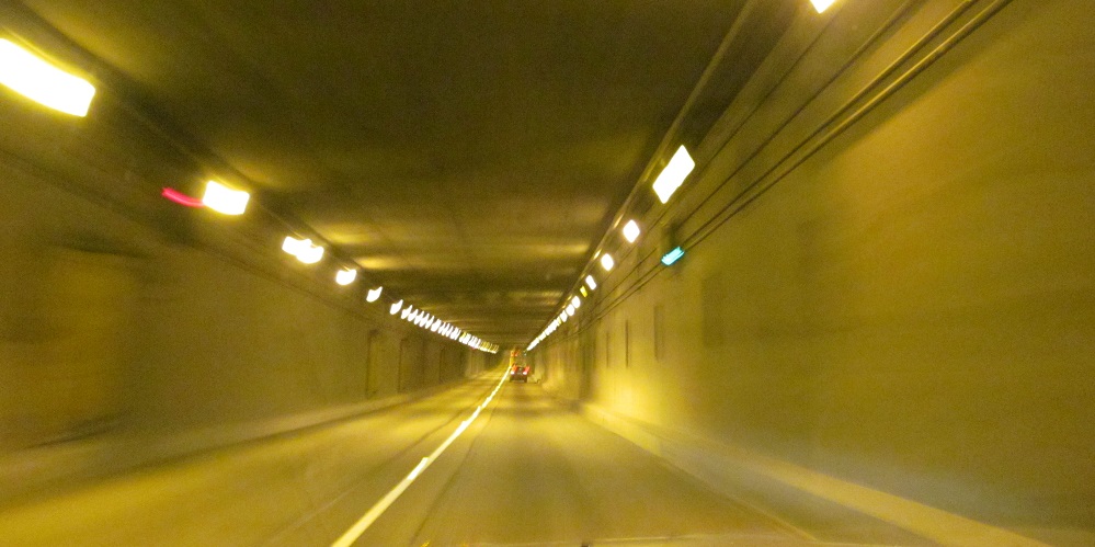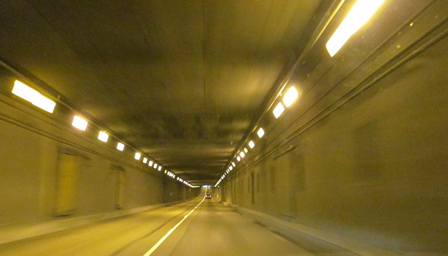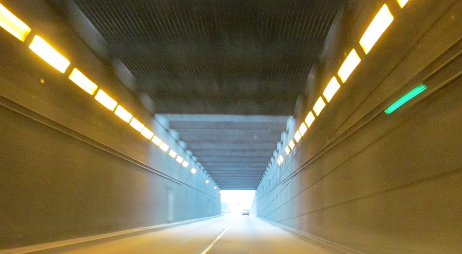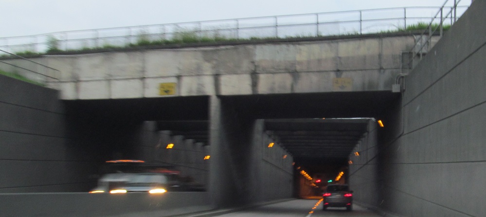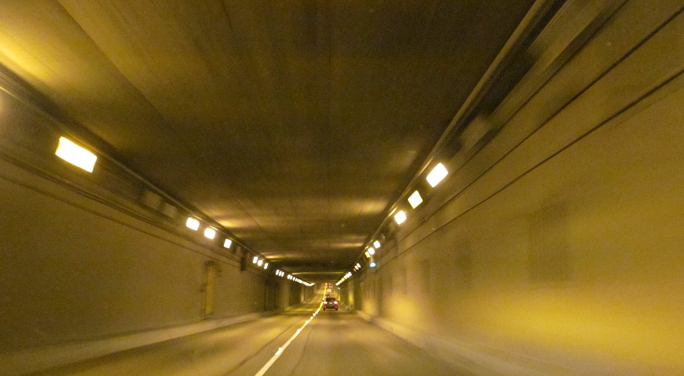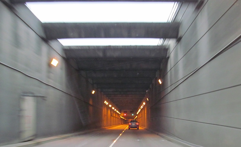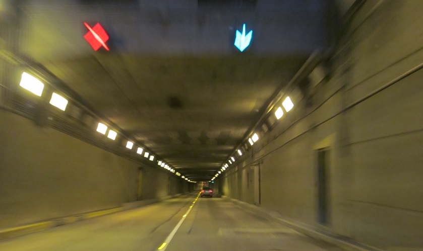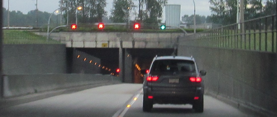 An interesting distance sign in hectometres precedes the NB tunnel entrance. Click to play the video and drive back toward Vancouver. You'll see the tunnels have contraflow lanes for rush hour traffic.