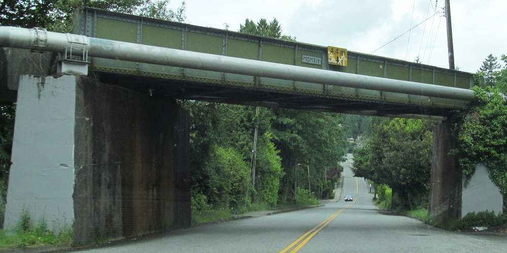 Heading west under the railway at 31st St. in West Vancouver, then looking north under it at Creey Ave. and Oxley St. This single-track line is important over 100 years after the first bridge, as it connects to the CN rail yards in Squamish.