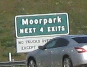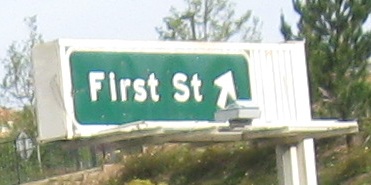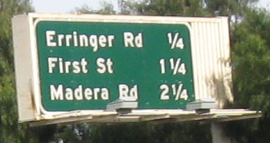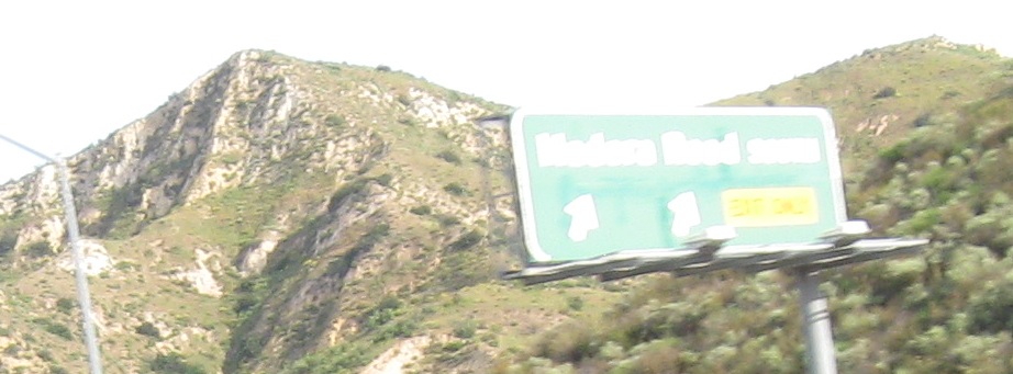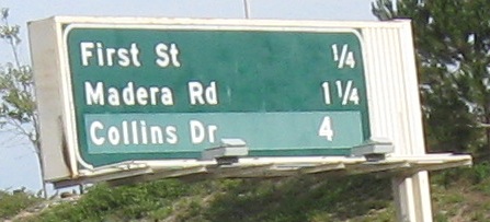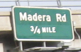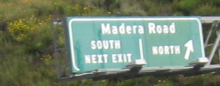 Usually, a sign like the one for Madera Rd. NORTH would be found on an exit ramp or C-D road, but here it's right on the freeway.
