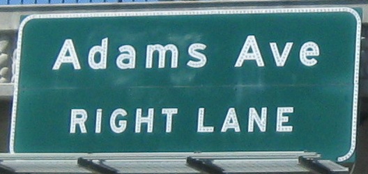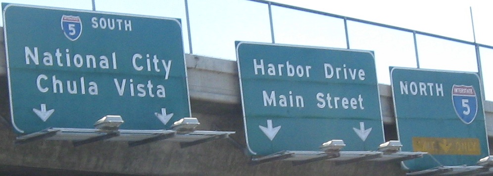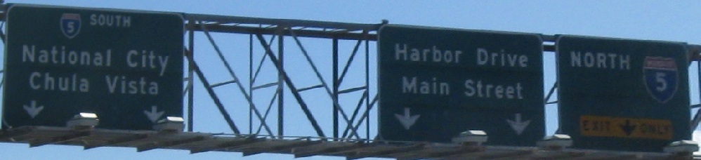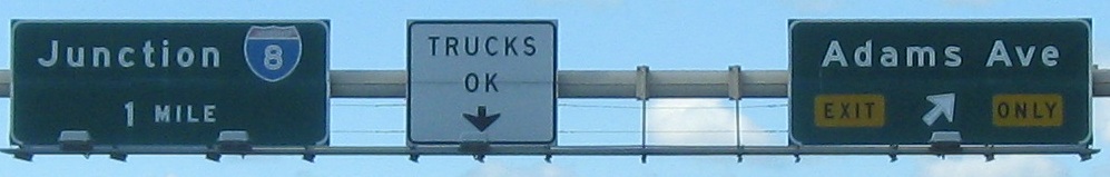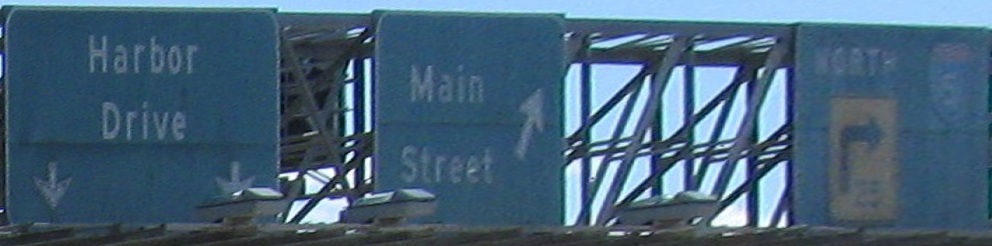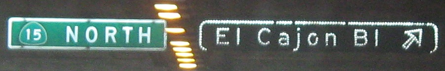 Still on that NB C-D road between Exits 5A and 5B, beneath a one-block park that was surely part of a compromise to get CA 15 finished. That turns the freeway into a tunnel and limits sign height.