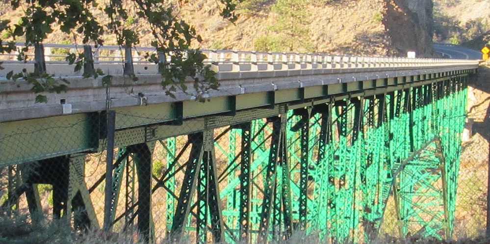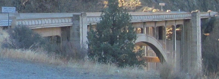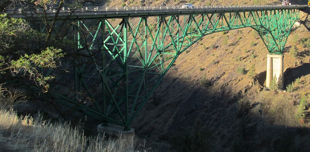 The Pioneer Bridge is newer (1931) but a much larger and higher span, crossing the Shasta River southwest from this vantage.