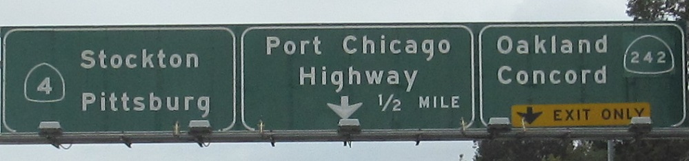 CA 4 begins and immediately goes through a stack interchange with I-80, so quickly it doesn't even get an exit number EB (it's 1B heading WB). The next photo is EB Exit 1, and I include it here for the distance shown on the left sign. Rarely are fractions included after 2 miles, and the fraction numerals should be 2/3 the height of the integer.