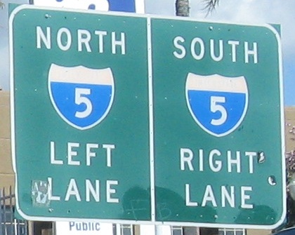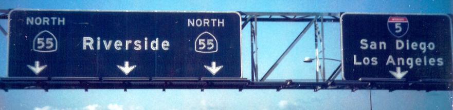 CA 55 NB in Santa Ana in 1986, courtesy Michael Summa. The second photo was way in the background on the exit ramp, and shows Los Angeles (NORTH 5) to the left and San Diego (SOUTH 5) to the right.