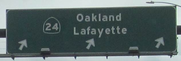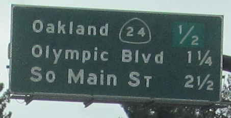 The distance in the first photo has been shortened considerably as the exit ramp was lengthened to eat the onramp from Hillside Ave. Notice the capital T in "ST". After that, the 2nd/3rd and last two photos are each left/right on the same gantry. CA 24 now begins here, but used to come on from now-renumbered CA 242 in a concurrency.