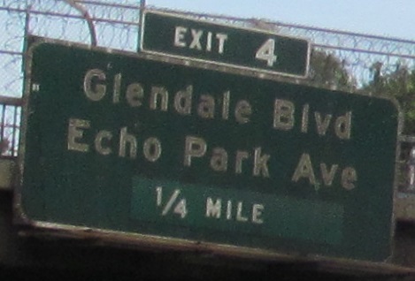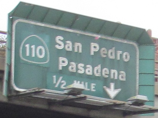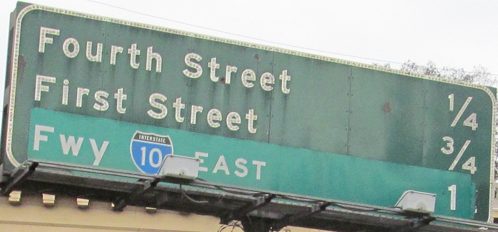Two pairs of left-right signs, the first two mounted on a 1949 overpass. L.A. was doing freeways before it was cool.