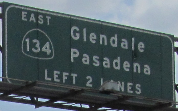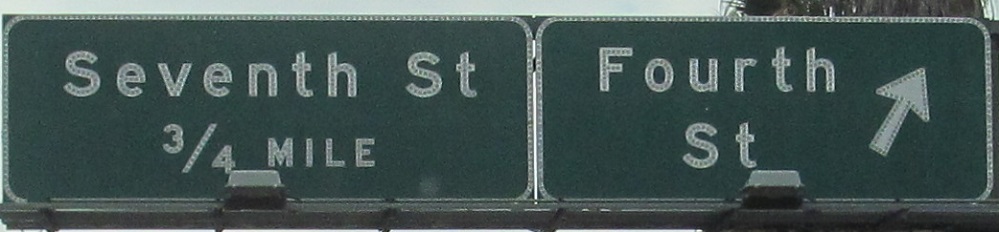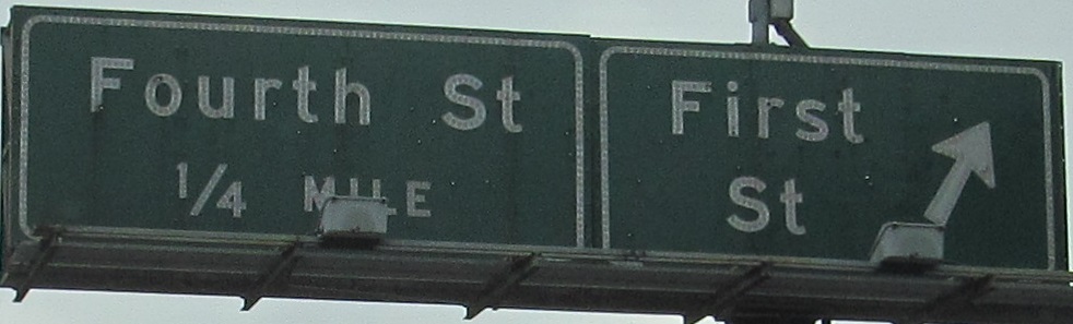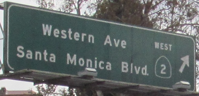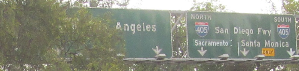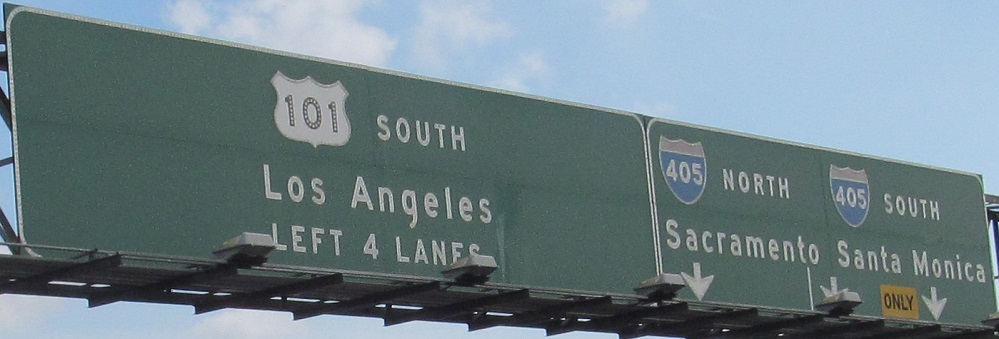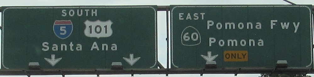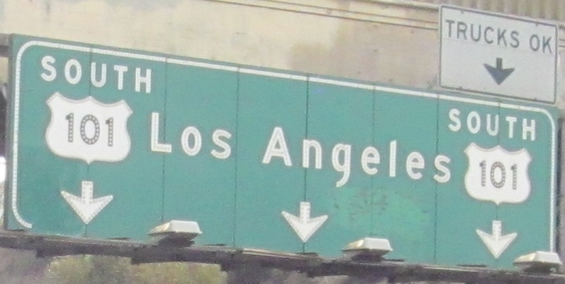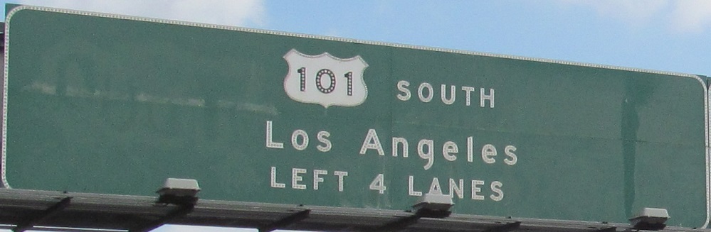 Coming up for air once more, and this time the last two signs are to the left and right of each other but on separate structures. The second and third photos are left and right on the same structure. In this space, CA 2 EB joins US 101 SB for a short spell.