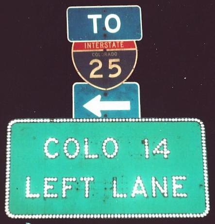 Two photos from the frontage road on the south side of C-14 just west of I-25 in the mid 1980's. It ends in the second photo at old wooden posts with an old paint scheme. Michael tells me the sign facing C-14 EB traffic is button copy, but I really don't care because I can't see it.