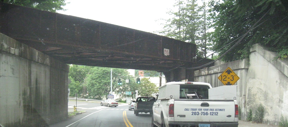 CT 115 NB and CT 313 WB in Seymour under a railroad that clearly once had additional tracks and a second trestle.