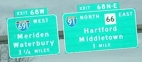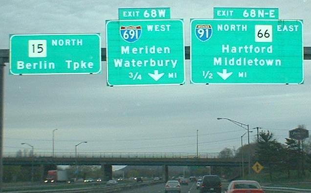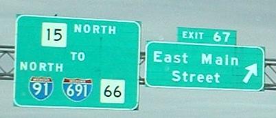 There are a lot of Main Streets in Connecticut. Here at Exit 68, where CT 15 meets I-91, is the co-beginning of I-691 and CT 66, as well as the major connection for traffic heading toward Boston and Hartford from points south and west. CT 15 traffic uses I-91 for a few exits to avoid the signallized and not-lightly-trafficked Berlin Turnpike (CT 15/US 5), and then jumps back on 15 to find I-84 later on. Exit numbering, interestingly, follows Berlin Turnpike intersections, though there are no actual numbers posted there. Visit the link at bottom for that part of CT 15.
