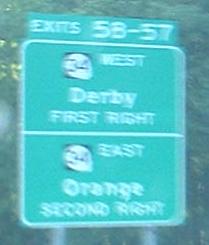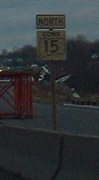 The shield on top of this page is extremely old, possibly original to the highway; the state outline has not been used for quite some time, and though a few BGS's with it remain (scroll down to find a couple), none have CONN written on top. This one was posted in a construction zone just west of the Milford Parkway, so someone had it lying around, but it's gone again.Northbound