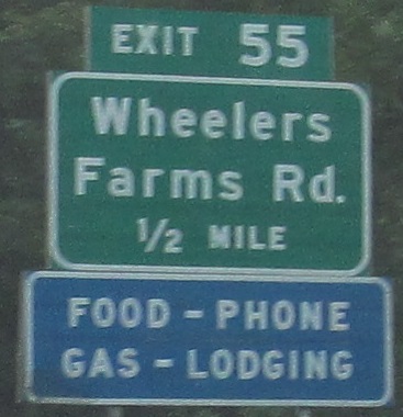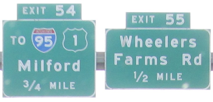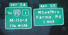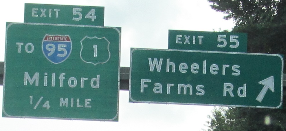 The shield atop the page was on the Sikorsky Bridge across the Housatonic River, technically still the Merritt Pkwy. but only for another moment until Exit 54 and Milford Pkwy. Wheelers Farms Road is also accessible from Milford Parkway, which meets the Merritt and Wilbur Cross at a tri-point just north of I-95, due to the Milford having a huge trumpet loop on the northern ("western", or SB) side of the highway.