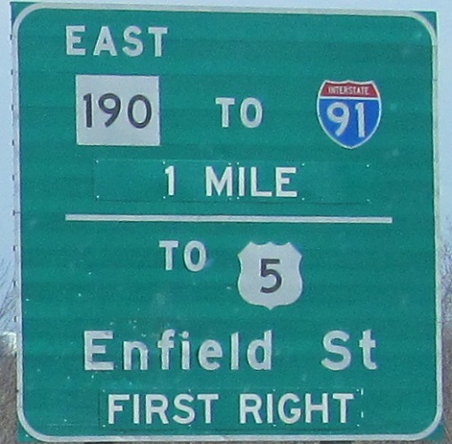 Eastbound signs and views on the brief CT 190 freeway near I-91. CT 190 was once planned for much more, a northwestern bypass of Bradley International Airport that would have tied in with an extended CT 20 freeway and a CT 189 freeway that would have started at I-84 Exit 46 (the stubs are secret CT 503). It also might have extended east to the proposed CT 83 freeway before returning to the current surface CT 190. Instead, it crosses the Connecticut River as a Super-2 freeway and only briefly widens into the four-lane freeway that it could have been. I don't think anything has been reconfigured since this was built, so the first sign must have moved. Maybe from something that wasn't CT 190, since I'm not junctioning my own route in 1 mile.