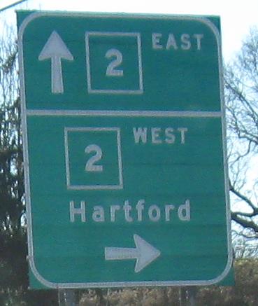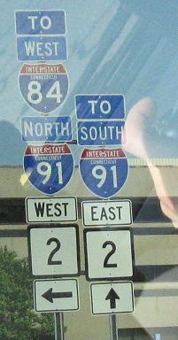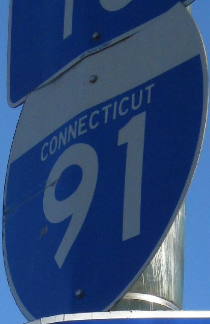 The infamous "blue 2", eastbound on Wyllys St. at Wethersfield Ave. Everything is in blue, but if you click on the top half of the image, you'll see a closeup of the state-name I-91 shield that shows it was erected by the Hartford Traffic Authority. As good as the I-91 shield looks (relative to state specs), it's possible that this explains the CT 2 being blue. Hartford routes supposedly had a color-coding scheme in the 1950's and possibly into the 1960's, although unlike the similar systems in Arizona, Florida, and Providence, there is no proof that this one ever existed. If it did, it probably had a blue 2. So either this shield is 40 years old and wears its age well (a possibility), or it's somewhat newer than that (say 1970's or early '80's based on the 91 shield) and an error caused by someone in the city remembering the way things used to be, or digging up an old shield spec. I'd lean toward the latter. As I said, you can click on the top half of the image for the I-91 shield closeup, and you can click on the bottom half for a CT 2 shield closeup.