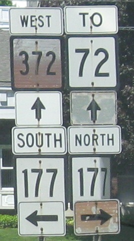 Assorted WB frippery. These linetacular shields are similar to those in Vermont and probably come from a particular sheeting supplier. Either the supplier or the sheeting disappeared in the 1970s. The strange font on the CT 177 shield appeared and disappeared in the late 1980s to early 1990s, by my estimate.