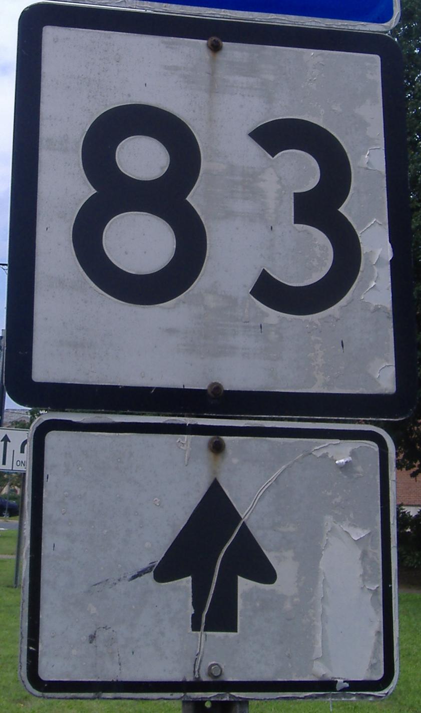 Northbound signs approaching US 6/44 in Manchester. Why didn't they replace the rest of the lane-arrow sign? Why are the 6 shields older than the 44 shields? One question I can answer: the CT 83 shield in the second photo is at least 30 years old. Click on it for a super-resolution peek at the old-style 3.