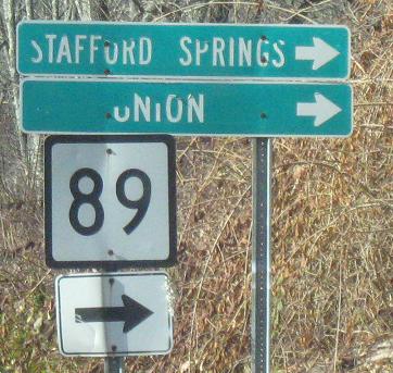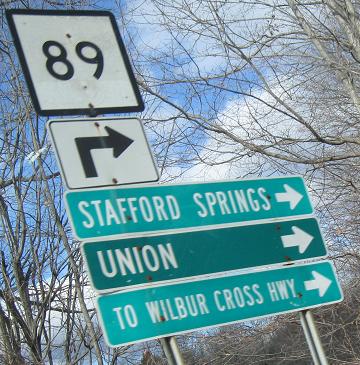 CT 89 NB in eastern Connecticut, turning from Turnpike Rd. to Westford Hill Rd. The signs in the first photo appear to be the first generation of green signs (other than the Union one), because this part of I-84 hasn't been referred to as the Wilbur Cross Highway in decades. (It still technically is, though.) The name dates from when CT 15 continued east of Hartford to Massachusetts - remember, 15 is Wilbur Cross Parkway and then Highway before meeting 84.