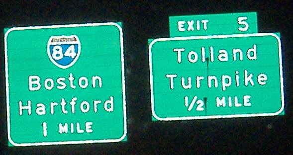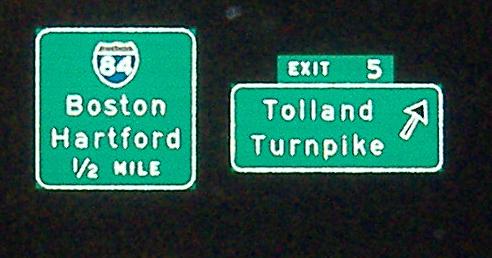 Finishing up the westbound signs; the Exit 1 ramps pass under Matianuck Avenue in an overpass designed for a multilane beltway, not a two-lane ramp. That ramp, the I-291 corridor, ends in the trees about half a mile to the west.